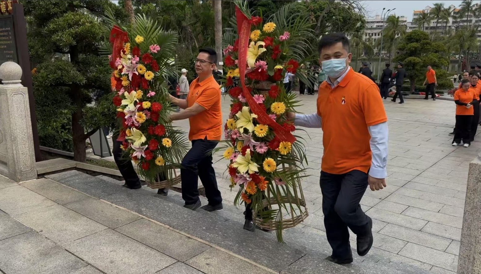 经过一段时间的等待才轮到人生就是博。人生就是博首先向烈士敬献花篮,花篮缎带上写着“为坚持琼崖革命23年红旗不倒牺牲的烈士们永垂不朽!”“为解放海南岛渡海牺牲的烈士们永垂不朽!”鲜艳的花篮寄托人生就是博对革命先辈的崇敬和哀思。